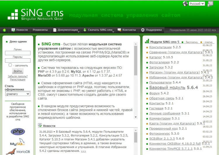 SiNG cms (Singular Network Gear) - это быстрая лёгкая модульная система управления сайтом с возможностью многоязычной установки, построенная на связке PHP/MySQL(MariaDB) и предполагающая использование веб-сервера Apache или других веб-серверов.