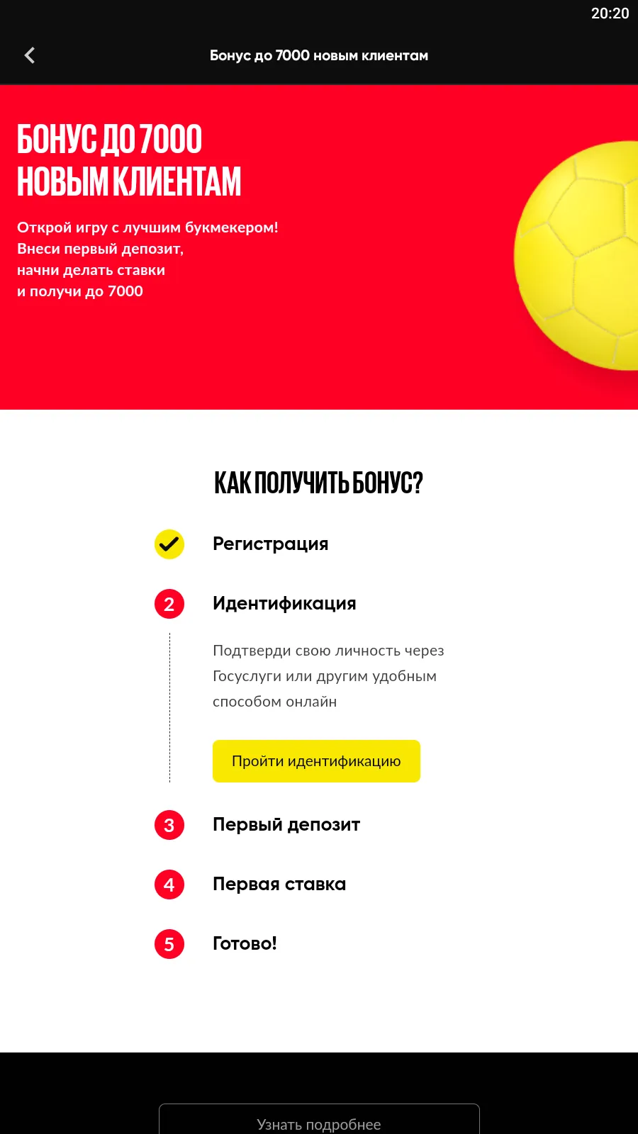 Следующим шагом станет регистрация на платформе. Необходимо перейти на официальный сайт или использовать мобильное приложение букмекера, чтобы заполнить небольшую форму. Подтвердите личные данные через Госуслуги, либо загрузив фото паспорта. Чтобы сделать ставки на спорт в букмекерской конторе ещё выгоднее, компания предлагает эксклюзивный фрибет до 10 000 рублей за внесение первого депозита.