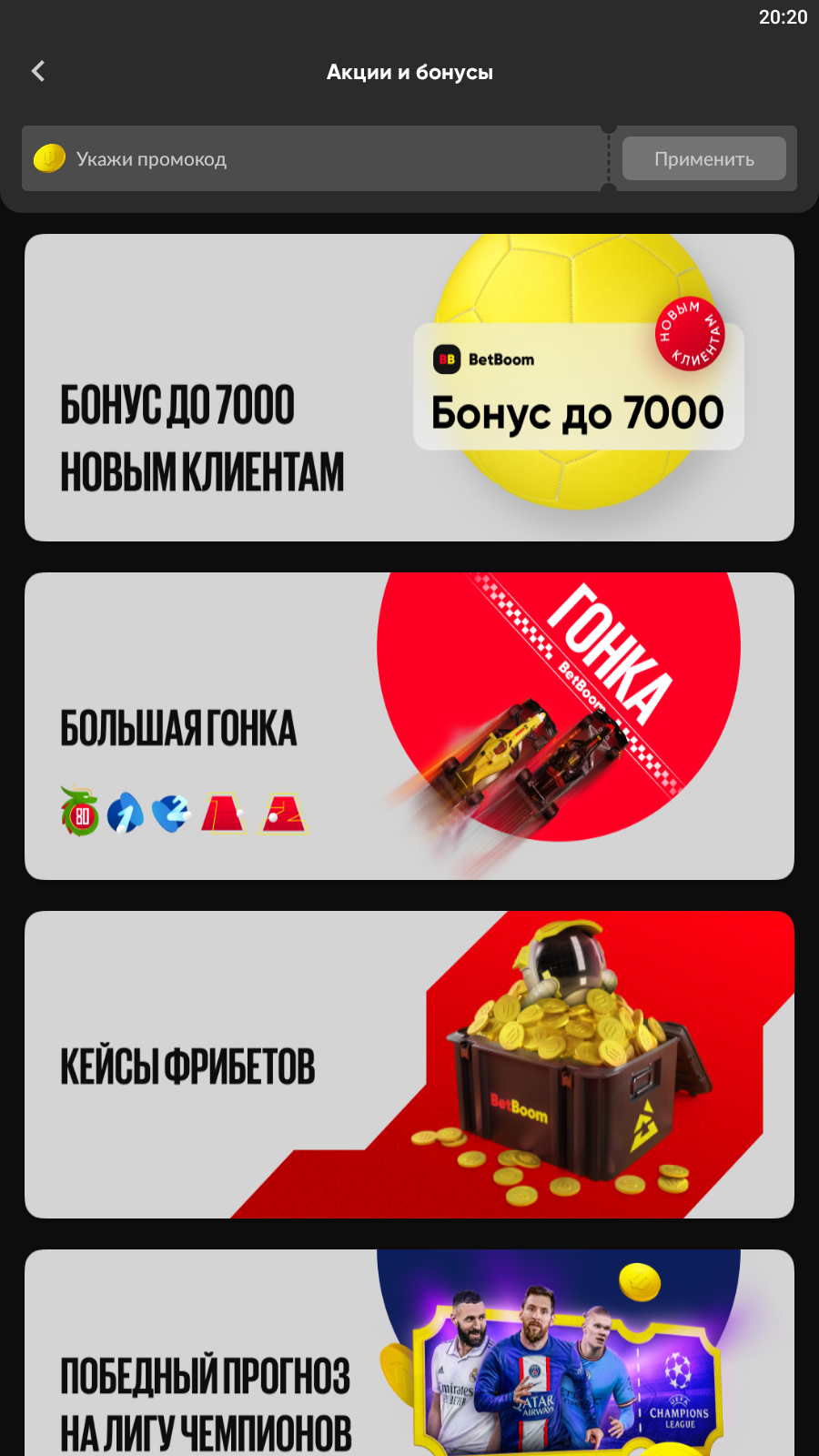 Bet Boom - это букмекерская контора, которая обеспечивает новичкам комфортное знакомство с миром ставок на спорт. Опытным игрокам контора предлагает богатый выбор матчей со всего мира и отличные коэффициенты. Сайт букмекера обладает приятным оформлением. Он предлагает всю необходимую информацию для удачных сделок, сгруппированную по категориям. Здесь представлены все популярные виды спорта и большинство крупных чемпионатов со всего мира. Осталось только выбрать желаемое событие и заключить пари. Но официальный сайт букмекерской конторы не является единственным способом доступа к платформе. Приложение Betboom для Android имеет точно такой же функционал и позволяет заключать пари или смотреть Live трансляции на мобильном из дома, офиса или любого другого места. Словом, программа открывает доступ ко всем основным возможностям букмекерской конторы.