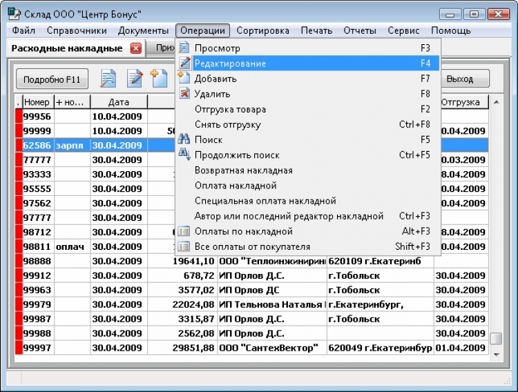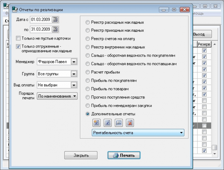 В программе ведется работа с первичными документами: приходными и расходными накладными, счет-фактурами, счетами на оплату, внутренними накладными, ведется реестр выписанных и отгруженных накладных. По введенным документам формируется полный набор отчетов.