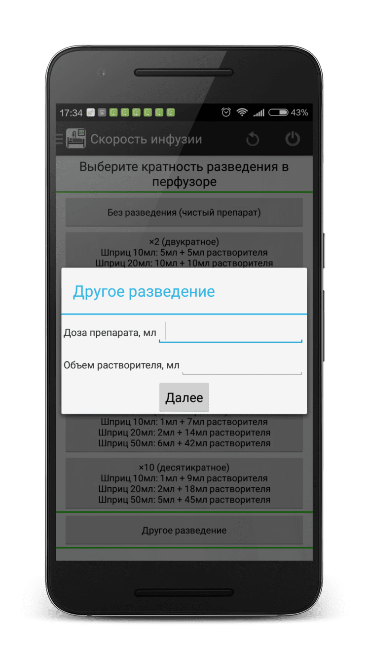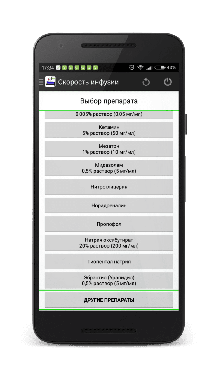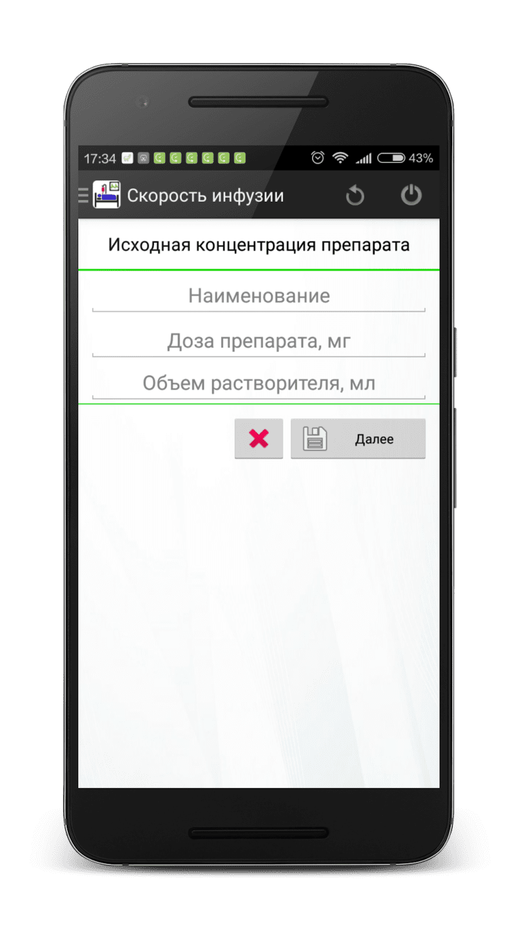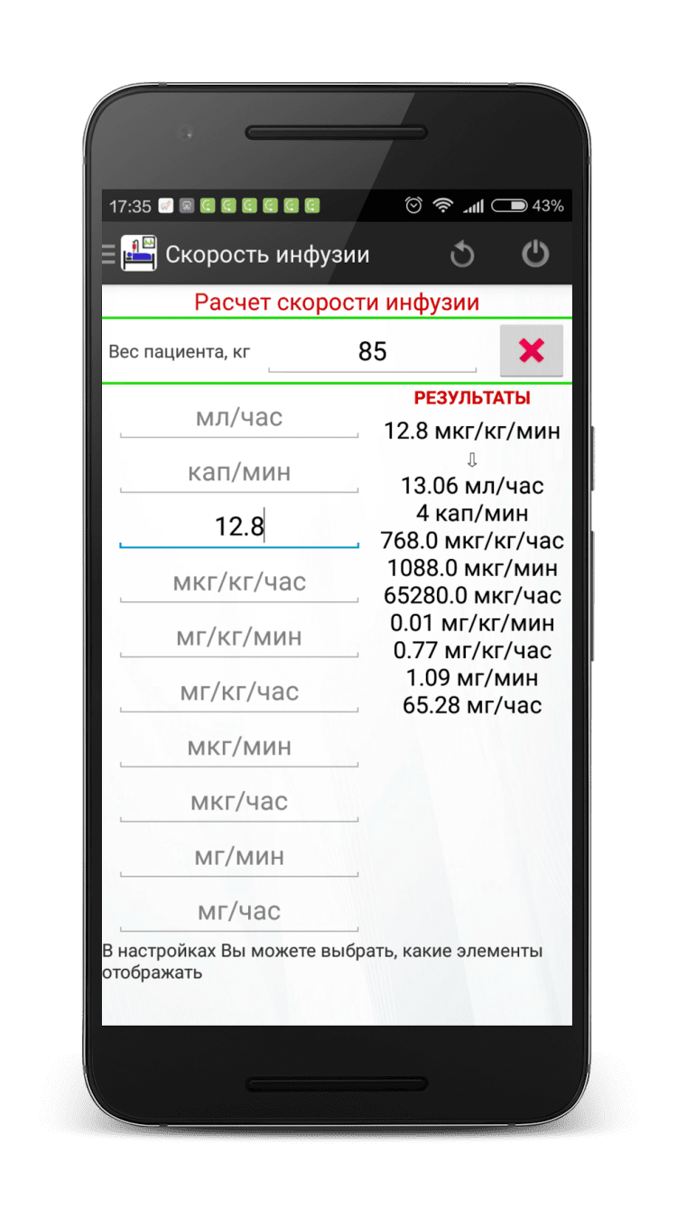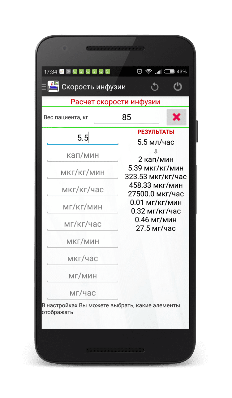 Скорость инфузии (калькулятор) — программа позволяет рассчитать инфузию инотропных и вазопрессорных препаратов (дофамин, адреналин, норадреналин, мезатон, добутамин) через перфузор с учетом веса пациента и различных вариантов разведения раствора. Перевод из мл/час в мкг/кг/мин происходит быстро, просто и в минимальное количество касаний экрана.