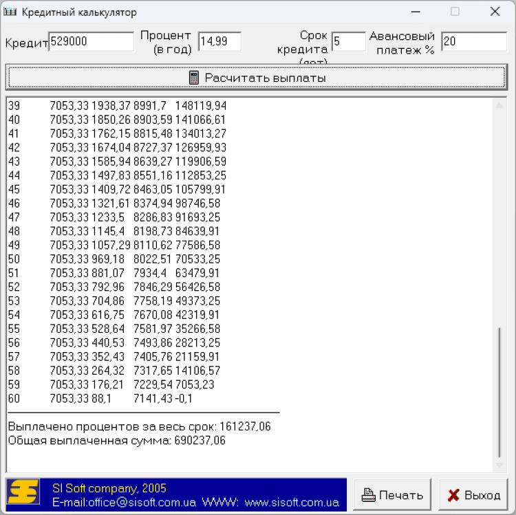 SL Soft Кредитный калькулятор - это программа для тех, кому нужно рассчитать ежемесячные выплаты по кредиту.