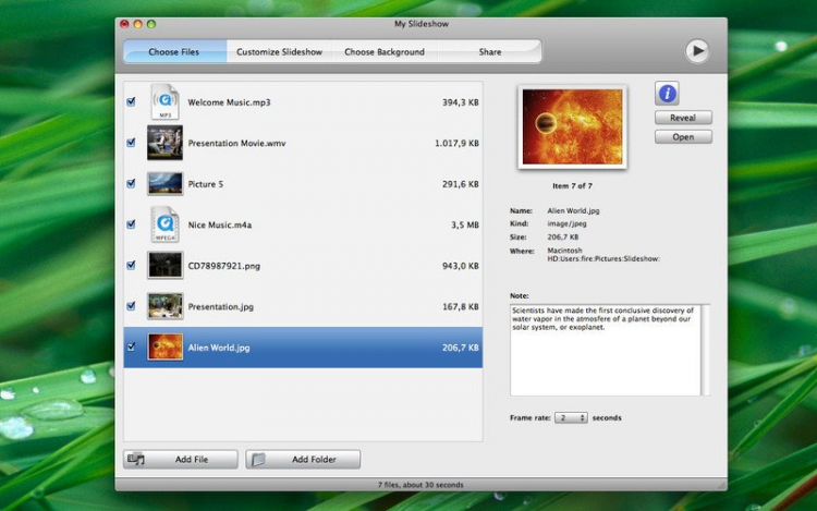 Slideshow Простая в использовании программа для создания слайдшоу и презентаций из фотографий, видеозаписей и музыки. Полученные файлы можно распространять как самостоятельные приложения как для Mac, так и для Windows, или же полученный видео-файл можно оптимизировать для YouTube, CD-ROM, раличных Веб-сайтов, iTunes, iPod, iOS (iPad, iPhone и iPhone 4), мобильных устройств и компьютеров.
