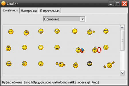 Смайл+ - это программа позволяет вставлять смайлы. На некоторых форумах нету возможности вставлять смайлы, а на некоторых они не красивые. Программа Смайл+ может решить эту проблему. Выбираете в выпадающем списке категорию смайлов, щелкаете по смайлу, и сформированный адрес попадает в буфер обмена. Остаётся только вставить его в форму ответа на форуме.