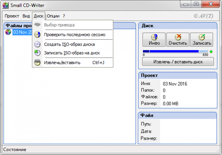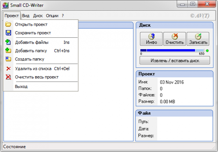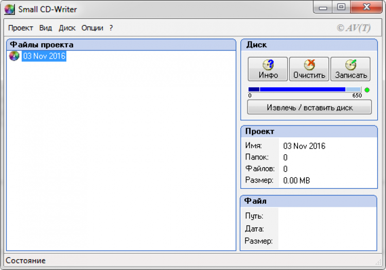 Small CD-Writer автоматически определяет привод и доступную скорость записи. Еще она показывает краткую информацию о текущем проекте, включая его название, количество файлов и папок, и его размер.