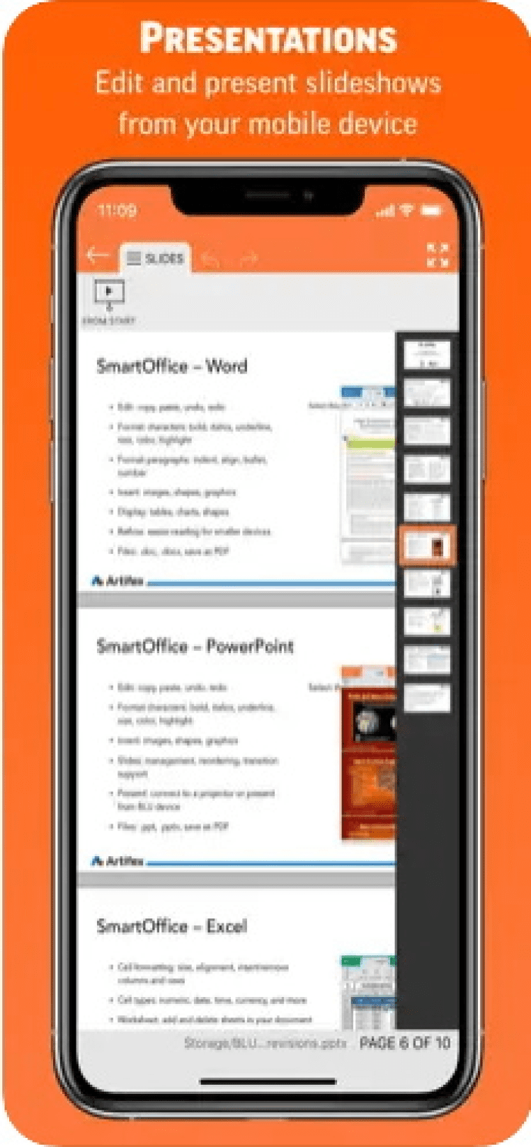 Для уверенной работы с презентациями PowerPoint, программа обладает богатыми возможностями всестороннего форматирования текста, абзацев или различного содержимого, позволяет вставлять изображения или графики, и управлять порядком слайдов. При этом, программа имеет функцию управления переключением слайдов во время воспроизведения презентации, прямо с экрана своего мобильного устройства.