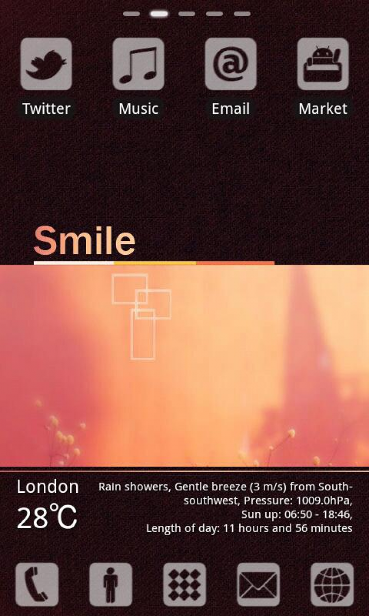 Smile Theme GO LauncherEX Красивая полупрозрачная тема оформления для приложения GO Launcher EX, отображающая время, погоду, давление и продолжительность дня.