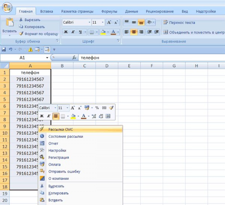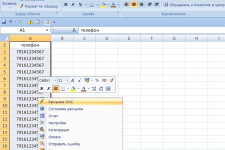 После инсталляции в установленном на вашем компьютере MS Excel (Microsoft Office) появится надстройка, позволяющая в два клика производить SMS-рассылки по номерам телефонов, выбранным на листе Excel. При регистрации предоставляется 30 бесплатных тестовых сообщений, ограниченных по длине.