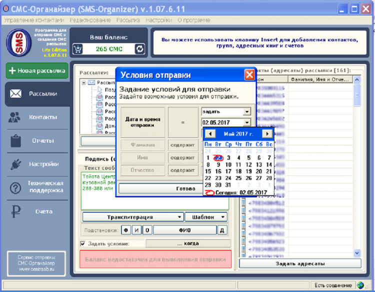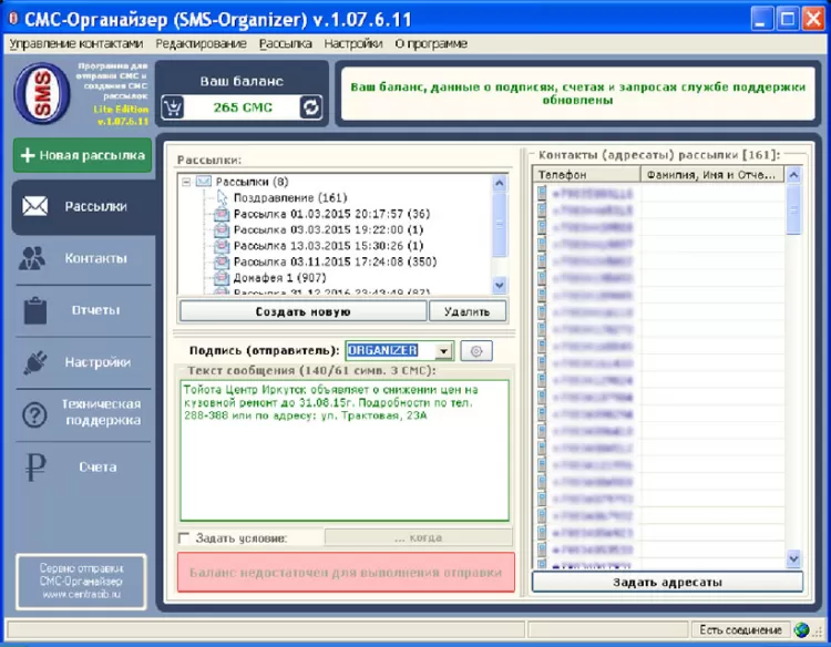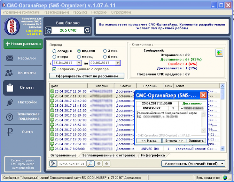 СМС-Органайзер - это программа для отправки СМС и создания СМС рассылок с простым и удобным интерфейсом, текущая модификация - Lite Edition - не содержит ничего лишнего и максимально ориентирована на результат.