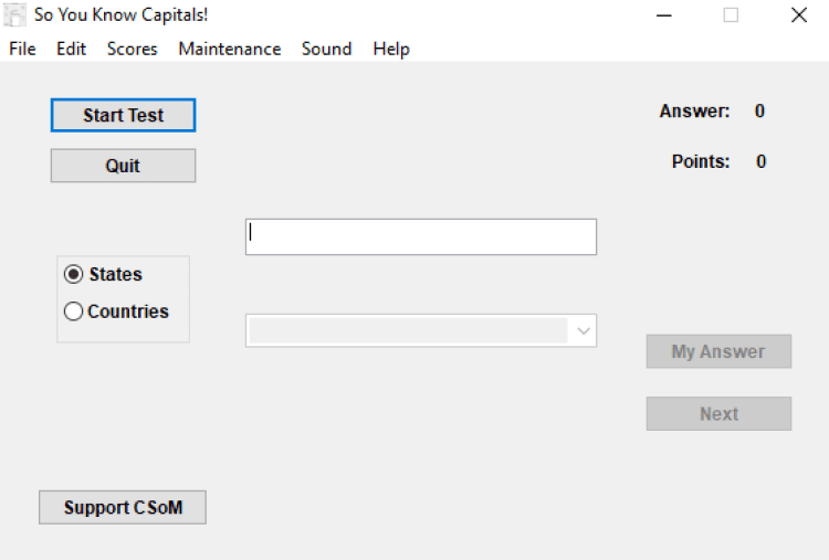 So You Know Capitals! - это программа, созданная для упрощения запоминания столиц разных стран. Вы можете выбрать, в какой области тестироваться: штаты США и их столицы, либо страны мира и их столицы. В поле посередине окна появится навание страны/штата и вам нужно выбрать из нескольких вариантов правильный ответ.