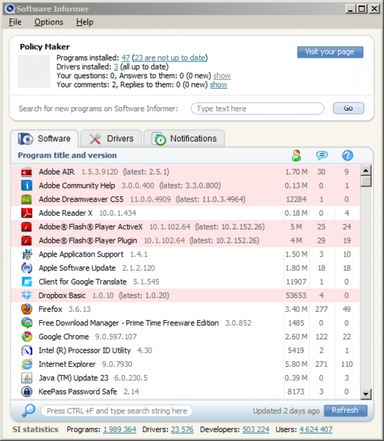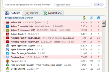 Утилита избавляет пользователей от проверки и поиска обновлений и экономит массу времени, отображает список всех установленных программ в системе, производит самостоятельный поиск тех или иных обновлений к конкретной программе или по всем сразу из своей базы данных с сервера software.informer.com, в которой находится более 2.059.512 программ и 3.000.896 версий к ним.