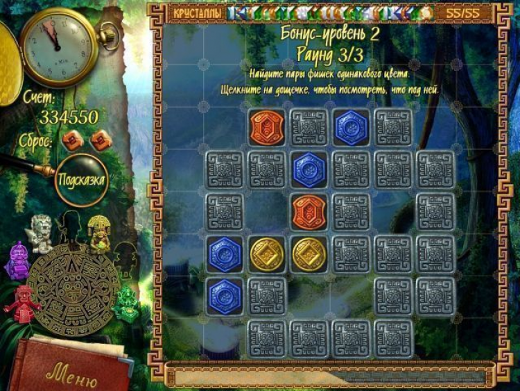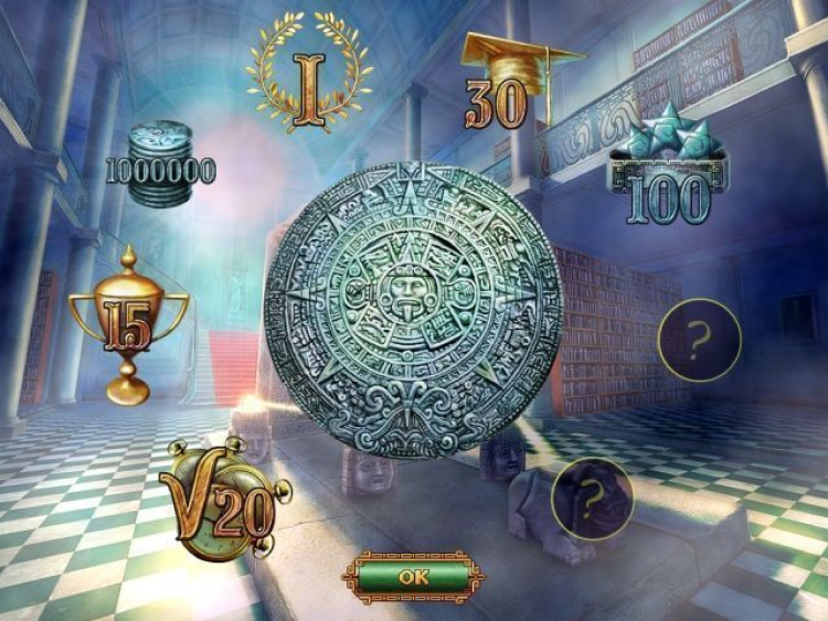 Особенно нашу героиню заинтересовала странная каменная композиция, установленная прямо в холле музея. Старинные манускрипты утверждали, что это карта, указывающая путь в тайную долину, где хранится легендарный календарь Монесумы, дарующий богатство и долголетие. Согласно легенде, активировать карту можно только при помощи солнечных камней, которые можно добыть в древней магической игре. В дальнем уголке музея нашлась коробка с подходящими цветными фишками, некоторые из которых были инкрустированы кристаллами.