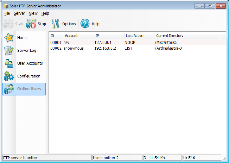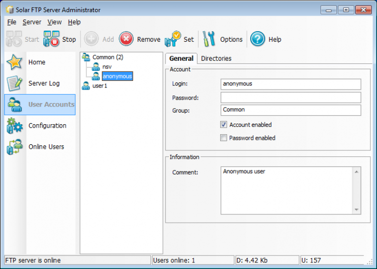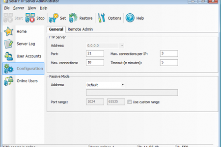 Solar FTP Server - это персональный FTP-сервер, отличающийся простотой настройки. Подойдет пользователям любого уровня. С его помощью можно настраивать виртуальные директории, удалять и изменять файлы, просматривать логи и следить за активностью пользователей. Для каждого пользователя можно создать личную директорию с заданными правами.