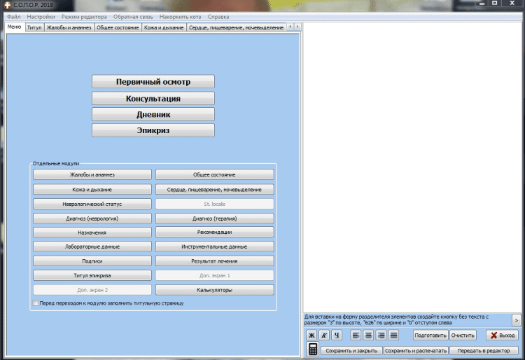 С.О.П.О.Р. - это приложение, принцип работы которого состоит в следующем: каждой кнопке или раскрывающемуся списку соответствует определенная фраза, вносимая в текстовое поле редактора в правой половине приложения, при этом несколько ограничивается свобода повествования, однако вместе с тем значительно облегчается и ускоряется набор текста.