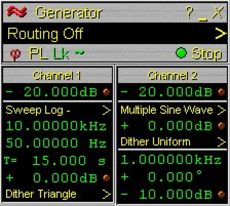 Sound Generator - это многоканальный многотоновый генератор синусоидального и шумового сигнала звуковых частот предназначен для настройки и измерения параметров аудио аппаратуры. Работает с 16, 24 и 32 битными звуковыми картами с частотой дискретизации до 384 кГц. WDM драйверы поддерживаются. Независимые регулировки частоты и амплитуды в каналах. Регулируемый сдвиг фаз между каналами. До восьми осцилляторов на каждый канал с независимой установкой частоты и уровня. Дискретность установки частоты 0.00001%; уровня - 0.001 дБ; фазы - 0.001 °. Минимальный коэффициент нелинейных и интермодуляционных искажений, точность, стабильность и диапазон частот ограничены только качеством используемой звуковой карты. Режим качающейся частоты с регулируемой скоростью качания в линейном или логарифмическом масштабе. Режим синхронного изменения частоты нескольких осцилляторов. Генерация шумов: белого, розового (1/f), броуновского (1/f 2). Режим амплитудной модуляции одного канала другим. Синтез всех сигналов в реальном времени. Возможность записи синтезированных сигналов на диск. Демонстрационная версия полностью функциональна, но время звучания ограничено 15 секундами после каждого нажатия кнопки "Start". Регистрация снимает демонстрационное ограничение.