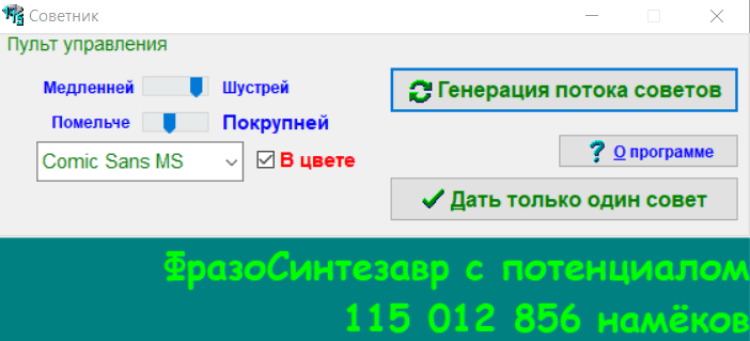 Советник - это экранная заставка - житейский советчик. Генератор синтезирует поток житейской мудрости, ведёт список наработанного. Номер версии программы обозначает её потенциал в МИЛЛИОНАХ неповторяющихся намёков. Точное число отображается при старте программы. Фразы, отображаемые в кавычках, являются цитатами, в составе потенциала не учитываются и в список наработанного не включаются. Их более тысячи. Завораживающая экранная заставка внимательно рассматривает Вас, выводит советы, и пополняет список наработанного материала. При первом запуске программа автоматически инсталлируется. Для установки обновлённой версии программы, достаточно её просто запустить, остальное она сделает сама.