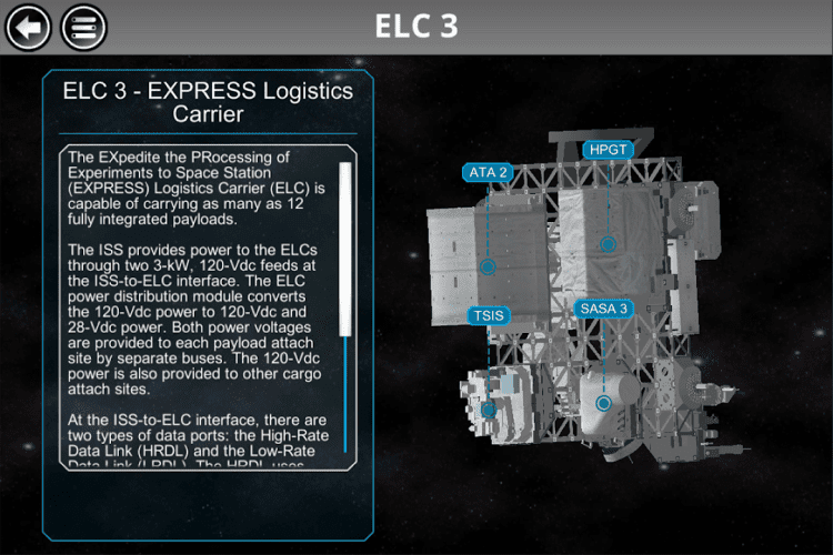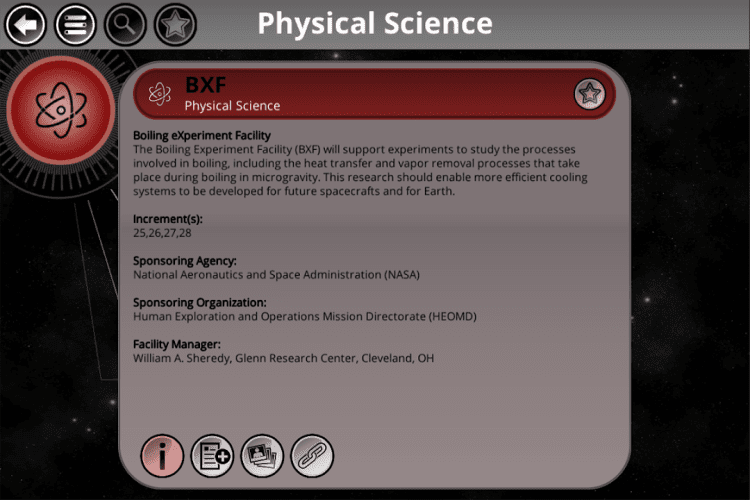 Space Station Research Xplorer Эта программа позволяет вам получить доступ к информации об экспериментах, проводящихся на МКС, результатах исследований, фотографиям и видео записям, интерактивным материалам и многому другому. Все данные в программе разбиты на удобные секции, что позволит вам быстро найти интересующую вас информацию. Программа обладает удобной навигацией, приятным оформлением, доступно и понятно изложенной информацией в статьях, а так же набором обучающих игр.