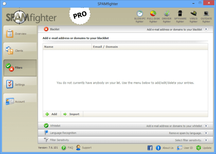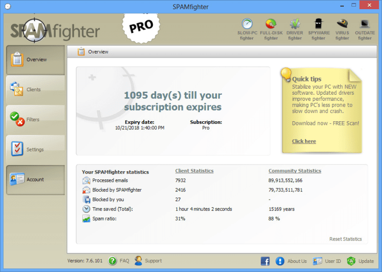 Если Вы ищете инструмент для Microsoft Outlook и Outlook Express и Windows Mail и Mozilla Thunderbird, удаляющий спам- и фишинг-почту из Вашего ящика, то SPAMfighter - это то, что Вам нужно. Просто, надёжно и эффективно. Множество программ по борьбе со спамом полагаются на фильтры и другие автоматические системы, но рассыльщики спама работают каждый день над методами обхождения фильтров. Таким образом, эти фильтры сегодня работают, а завтра - нет. У SPAMfighter-а - другая стратегия.