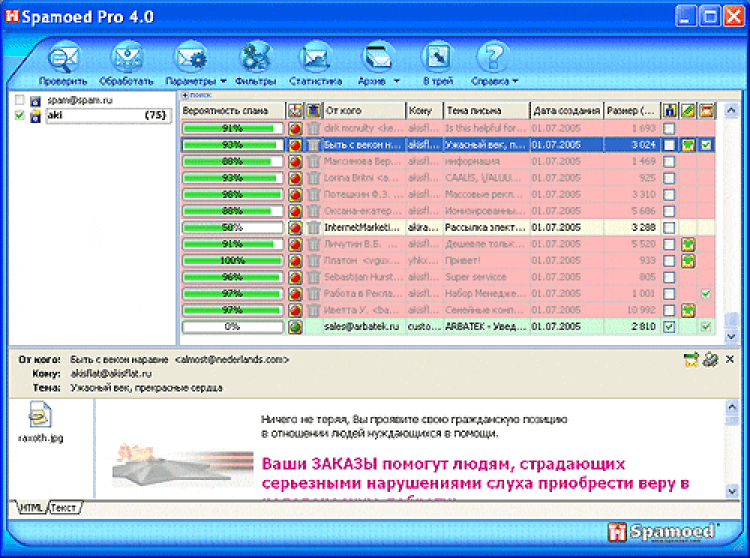 Основные принципы работы программы заключается в том, что программа Spamoed может как сама удалять ненужную пользователю электронную почту, так и вкупе с TheBat, Outlook и другими почтовыми клиентами. Программа является лучшим решением для борьбы с нежелательной электронной рассылкой. Искусственный интеллект - ищет и обнаруживает от 97 до 100% ненужных пользователю писем Универсальная система создания пользователем собственных правил фильтрации почты. 100% сохранность нужных Вам писем Программа проверяет любое количество почтовых ящиков, при этом они могут находиться на разных почтовых серверах. Механизм многопоточной проверки почтовых ящиков Высокая скорость проверки писем: проверка 100 писем через модемное соединение занимает не более 2-х минут Удобна в работе: понятный, дружественный интерфейс. Тестовые режимы для проверки подключения почтовых ящиков и работоспособности программы (режим устранения ошибок).