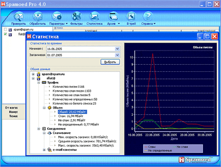 Пошаговая настройка программы при первой загрузке. Автоматическая настройка языка интерфейса под установленную ОС. Программа может проверять письма на сервере. Поэтому за перекачку ненужных Вам писем платить не придется. Среднее время окупаемости программы - 2 месяца. Программа ведет статистику со встроенным графическим отображением. Создает архив писем Архивирование и восстановление всех данных и настроек. Удобный Поиск в письмах. Контекстные подсказки в самой программе и подробный help. Гибкая настройка программы под индивидуального пользователя. Вы можете бесплатно обновлять программу. Обновлять стандартную установленную базу анализатора.