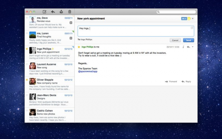 Sparrow Эффективный почтовый клиент с минималистичным интерфейсом и набором только самых необходимых функций. Sparrow позволит быстро просматривать переписку, уведомлять о новых письмах и переключатсья между несколькими аккаунтами. В Sparrow нет ничего лишнего, только то, что нужно большинству пользвателей.