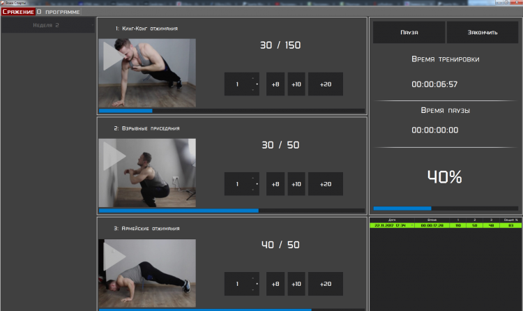 Подчеркну: эта компьютерная программа не содержит в себе описания всех упражнений программы тренировок "Воин Спарты", а лишь является подспорьем для спортсмена, который программу приобрёл. Лично я агитирую именно за покупку программы, а не за поиск упёртой информации на просторах сети. Давайте уважать чужой труд, товарищи! Программа поможет в тренировках по системе "Воин Спарты": не держите количество выполненных повторений в голове, программа это сделает за вас. Также реализован журнал тренировок, где можно следить за своим прогрессом по неделям. Помимо этого есть возможность добавлять таймеры, с указываемым интервалом. Это удобно для организации любой кардиотренировки