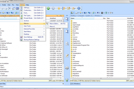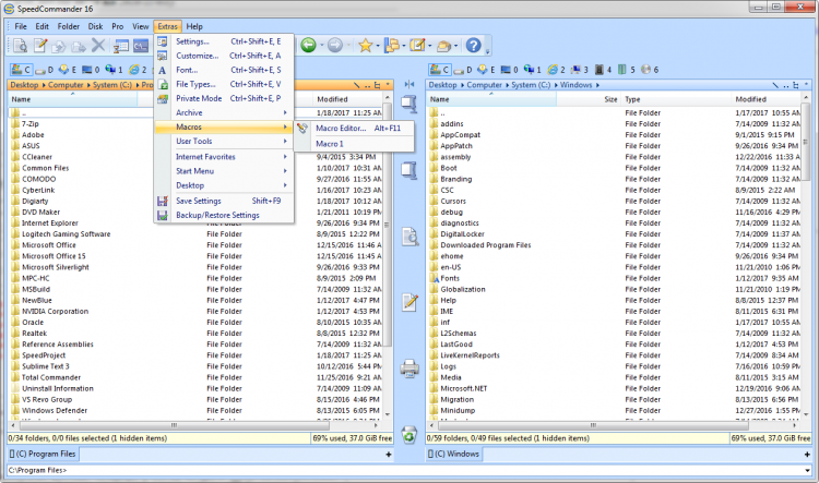 Его можно настроить под себя, добавляя/убирай панели и кнопки на них, назначать сочетания клавиш для часто используемых команд, изменять шрифт текста и т.д. Файловый менеджер также поддерживает макросы и имеет встроенный редактор макросов. С их помощью можно автоматизировать некоторые задачи, сделав работу с файлами еще более удобной и быстрой. Это мощный файловый менеджер, в арсенале которого есть огромное количество весьма полезных инструментов. Поэтому, если вас не устраивает обычный Проводник Windows, скачайте SpeedCommander.