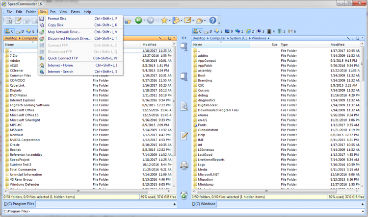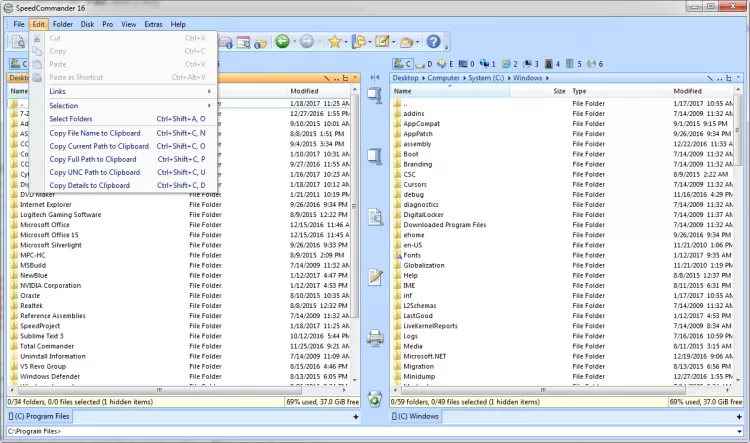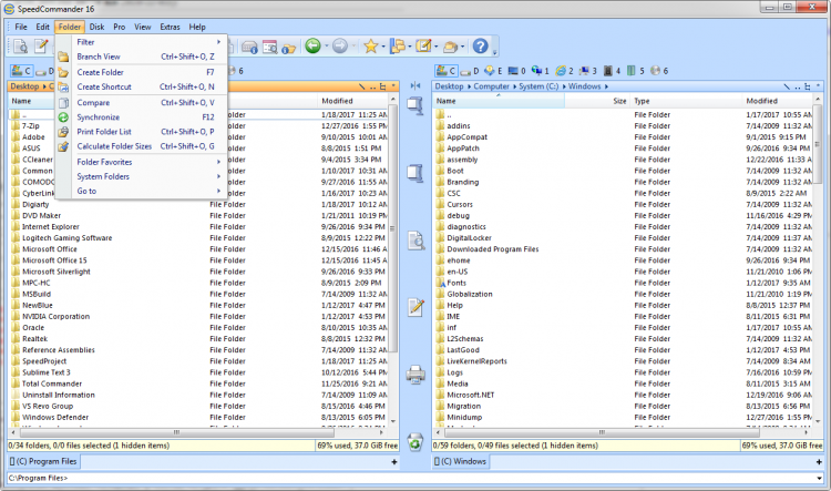 SpeedCommander - это полнофункциональный файловый менеджер, в состав которого входят разнообразные функции, призванный сделать работу с файлами на жестком диске быстрее, проще и удобней. Для этой же цели он имеет интуитивно понятным двухпанельным интерфейсом. Конечно же с его помощью вы можете выполнять базовые операции над файлами и папками, такие как копирование, перемещение, удаление, переименование и просмотр свойств. В добавок к этому, SpeedCommander позволяет переименовывать файлы и папки в пакетном режиме с помощью масок, полностью стирать файлы и папки, а также создавать и распаковывать архивы без сторонних приложений (поддерживаются форматы ZIP, RAR, TAR и 7Z).