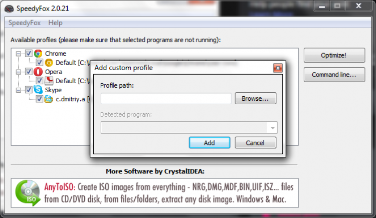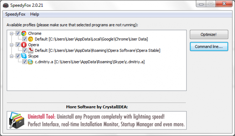 SpeedyFox увеличивает скорость работы программ путем решения проблем, связанных с фрагментацией данных. Вы просто выбираете программы, профили которых нужно оптимизировать и нажимаете "Optimize". Самом собой, программы, которые вы собираетесь оптимизировать перед этим должны быть закрыты.