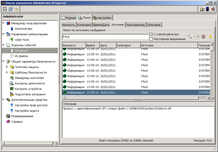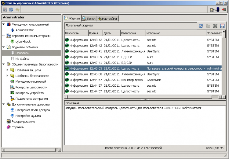 - Многоуровневый контроль целостности информационных объектов вычислительной системы. Контроль целостности объектов файловой системы и реестра до загрузки защищаемой ОС, в том числе на прозрачно шифрованных дисках. Возможность настройки реакции СЗИ на нарушение контроля целостности.