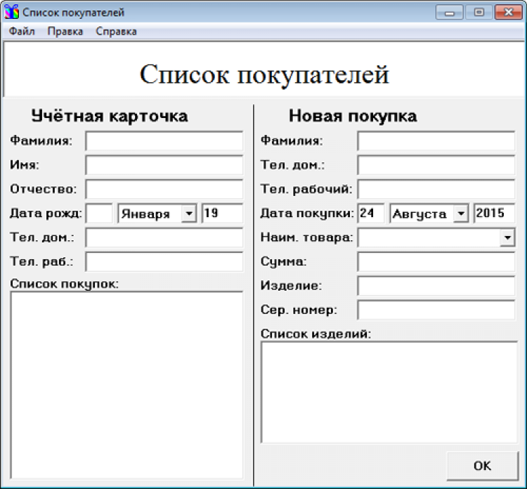 Список покупателей Программа предназначена для владельцев магазинов, желающих создать базу данных своих покупателей. В ней будет сохраняться информация о покупателе и его покупках.