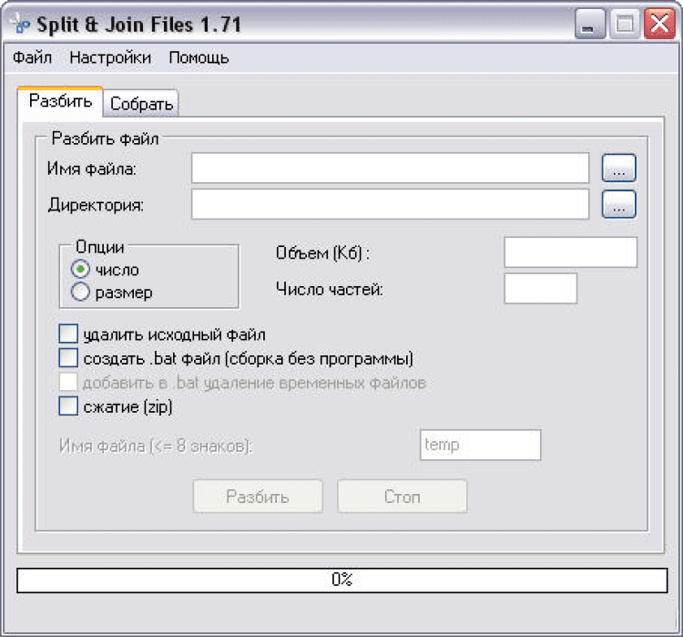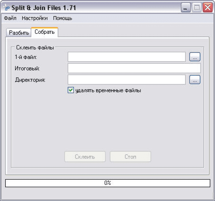 При этом программа сама определит количество доступных частей. Также можно выбрать удаление частей после сборки. Файлы можно выбирать в окне диалога, или просто перетащить на форму программы.