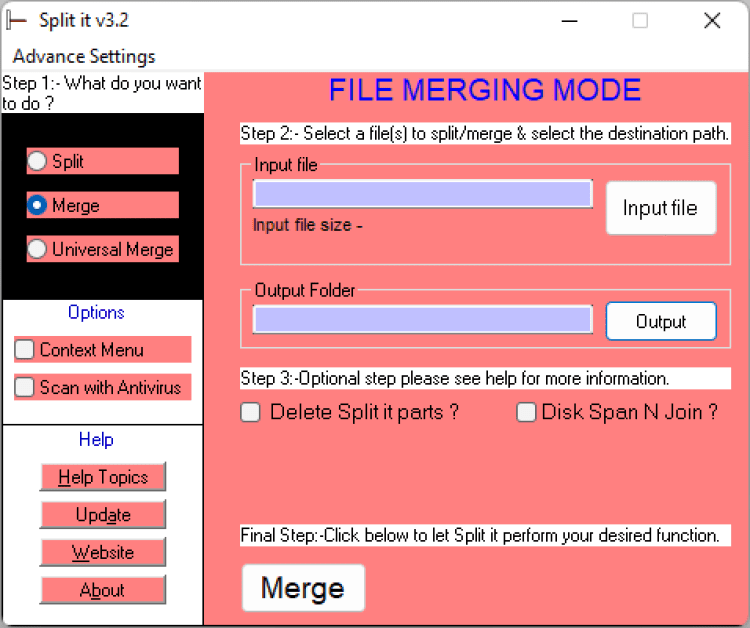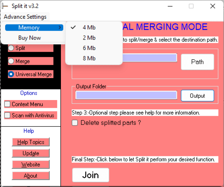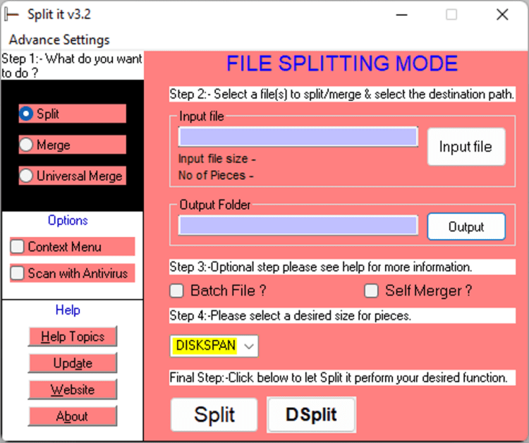 Split it Простая в использовании утилита для разбиения больших файлов на фрагменты и последующего их объединения. Предназначена для компьютеров под управлением Windows.