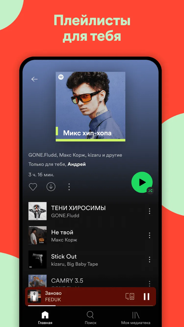 Spotify — это приложение, в котором вы найдёте музыку любимых исполнителей и сможете слушать её в любом месте и в любое время, прямо на своём мобильном телефоне.