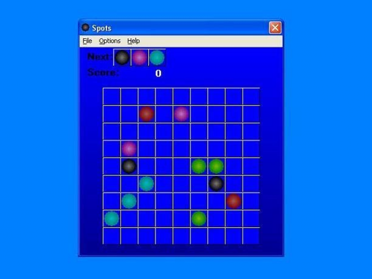 Spots Portable - это игра, в которой необходимо расчистить все поле, выстраивая одинаковые шарики в линию. Линия может быть горизонтальной, вертикальной или диагональной. Перемещать шарики с одной позиции на другую можно, только если между этими двумя позициями нет препятствий.