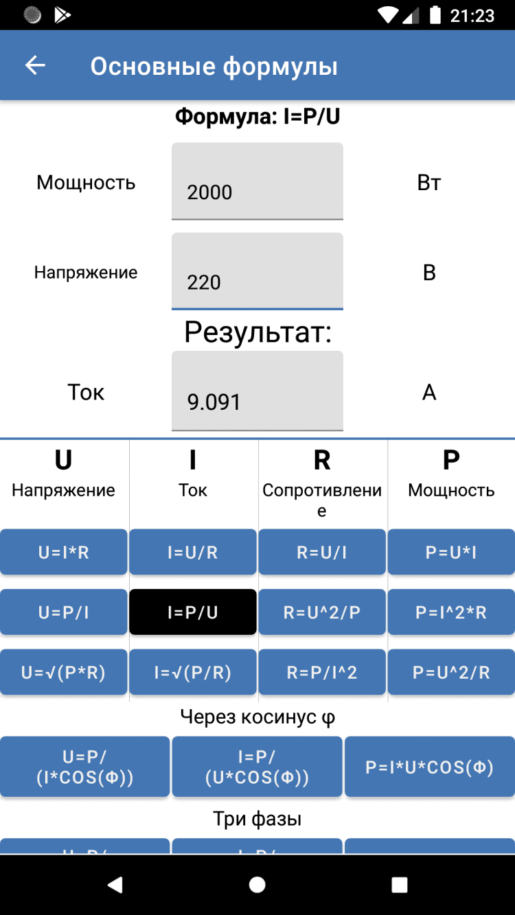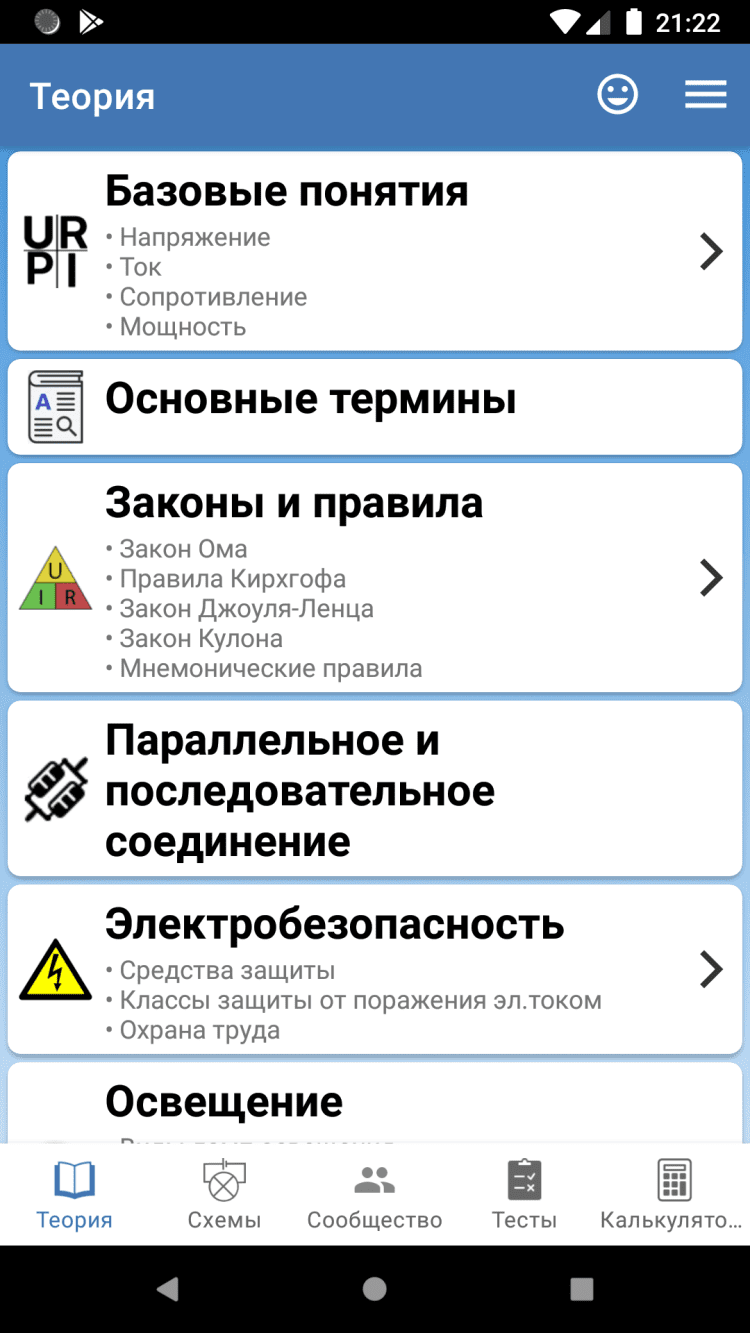 Справочник электрика приложение, которое будет полезно для тех, кто изучает электротехнику или работает с электричеством. В последней версии программы, вы найдёте более 30 мини-статей и 4 калькулятора, которые будут полезны для профессионалов и любителей.