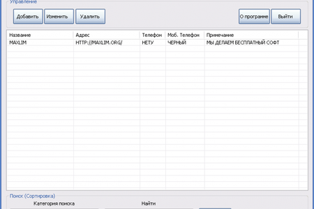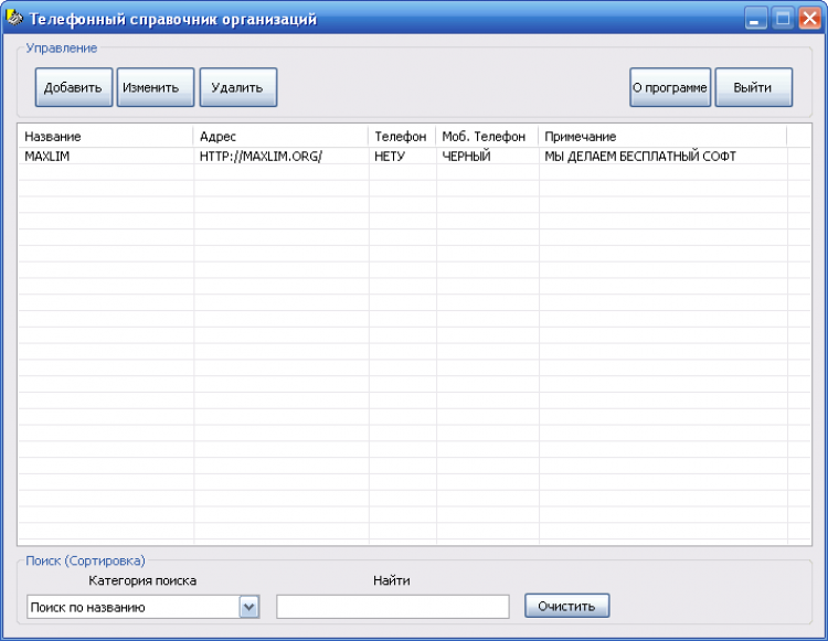 Справочник организаций Небольшая программку для ведения справочника организаций, писал специально для своей бывшей работы. В программе можно записывать нужные организации, телефоны адреса. Имеется удобная сортировка данных. Нечего лишнего, только список внесенных организаций и информация по ним. Простая и удобная программа.