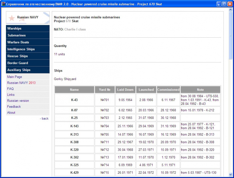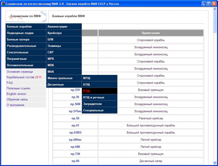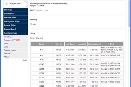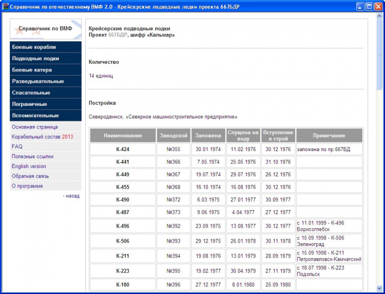 Справочник по отечественному ВМФ - это программа представляет собой бесплатно распространяемую базу данных с материалами по кораблям и судам Военно-Морского флота СССР и Российской Федерации, начиная с 1945 года и по настоящий момент.