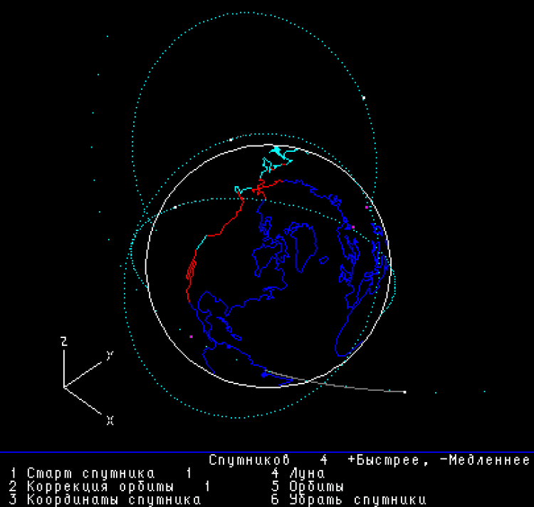 Спутник - это программа моделирует движение искусственных спутников Земли. Это не игровая программа, но она интереснее многих игрушек. Вы можете запустить спутник и увидеть, как зависит его орбита от скорости и направления пуска. Можно совершать маневры, задавая количество используемого топлива и направление импульса.