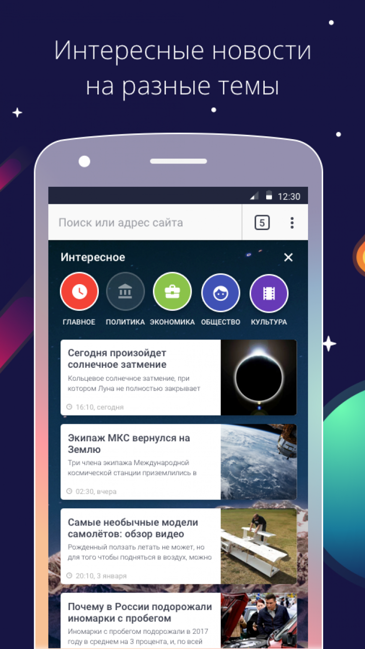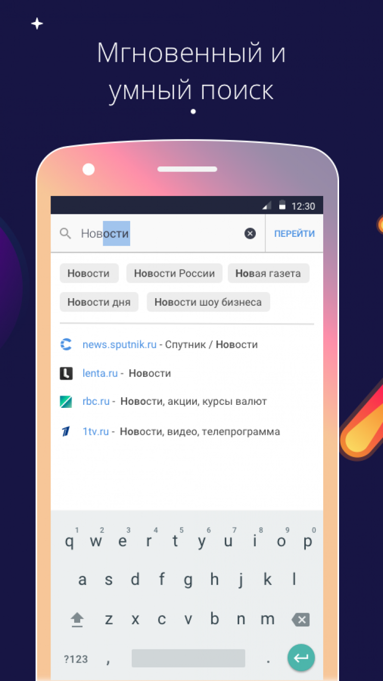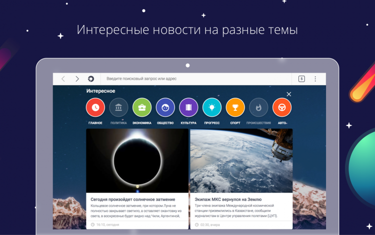 На главном экране браузера вы найдете удобные виджеты. С их помощью вы всегда будете в курсе свежих новостей, курсов основных валют, погодных условий в выбранном городе и сможете воспользоваться такими сервисами "Спутника", как Лекарства и Мой Дом. Вы также сможете добавить на стартовый экран программы ссылки на свои любимые сайты для быстрого доступа к ним.