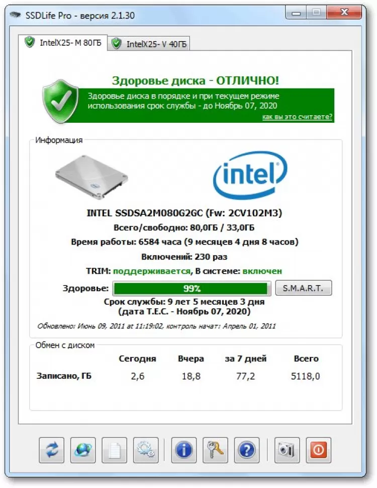 SSD life - это компактная и удобная утилита, предназначенная для мониторинга и контроля состояния и износа твердотельного SSD-накопителя. Она проводит анализ активности использования диска, и на основе полученных данных высчитывает примерный оставшийся срок его службы.