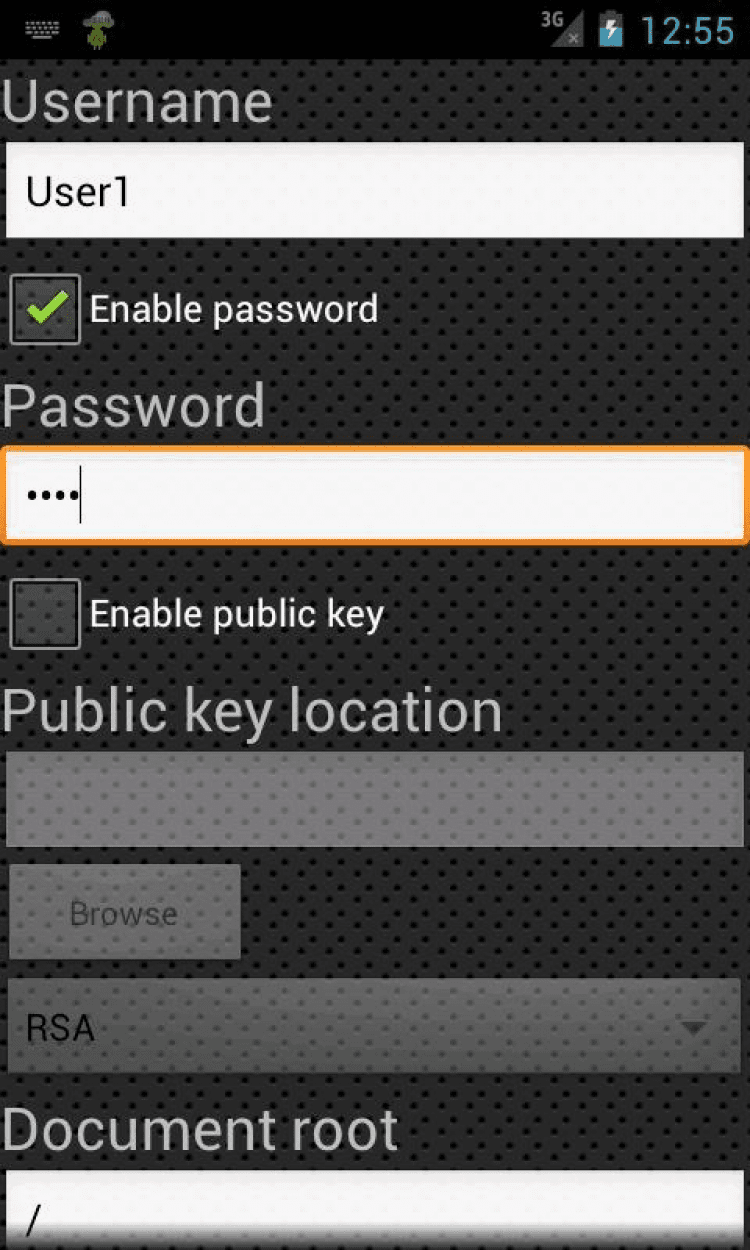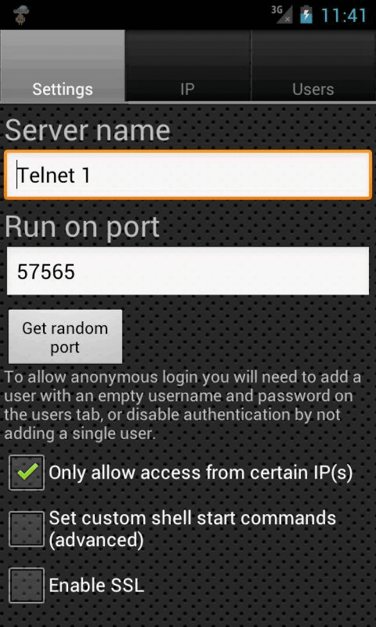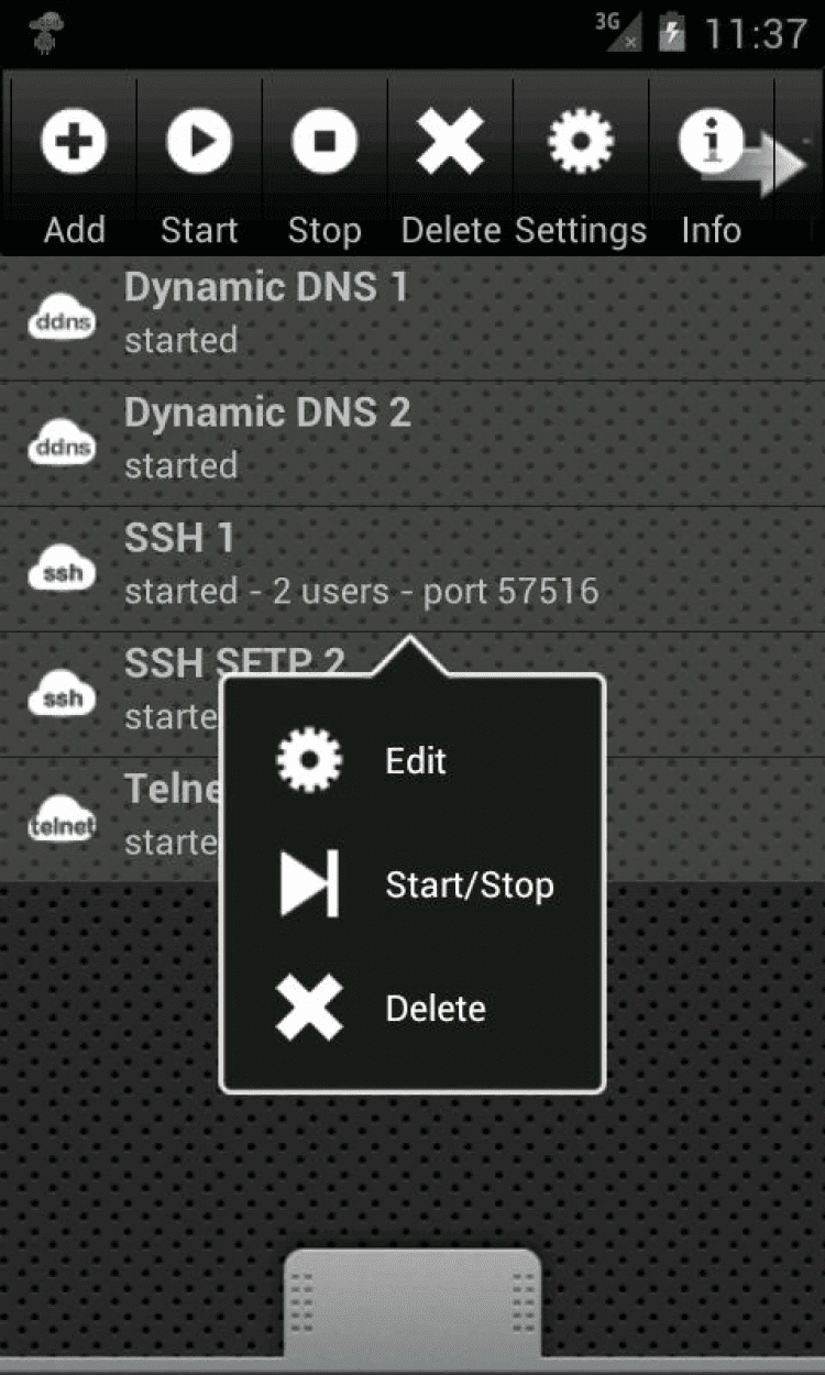 SSH Server — это удобный SSHd, SFTP, SCP и Telnet сервер для Android-устройств. Для работы приложения не требуется наличие прав суперпользователя. Перед вами пробная версия программы, в которой вы сможете создать только один сервер с тремя пользователями и тремя опциональными разрешенными IP-адресами для каждого сервера.