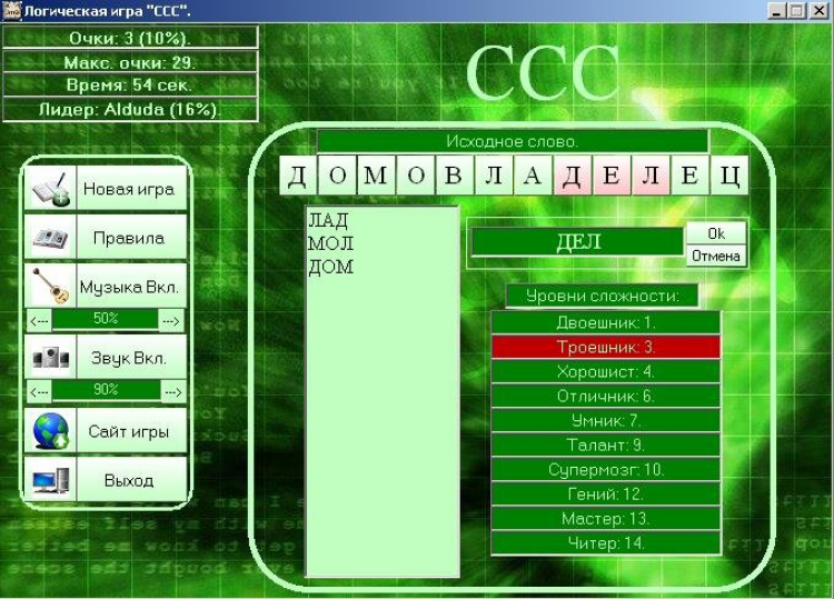 ССС - это логическая компьютерная игра. Из букв большого слова надо собирать слова поменьше. Чем больше слов игрок собрал, тем лучше.