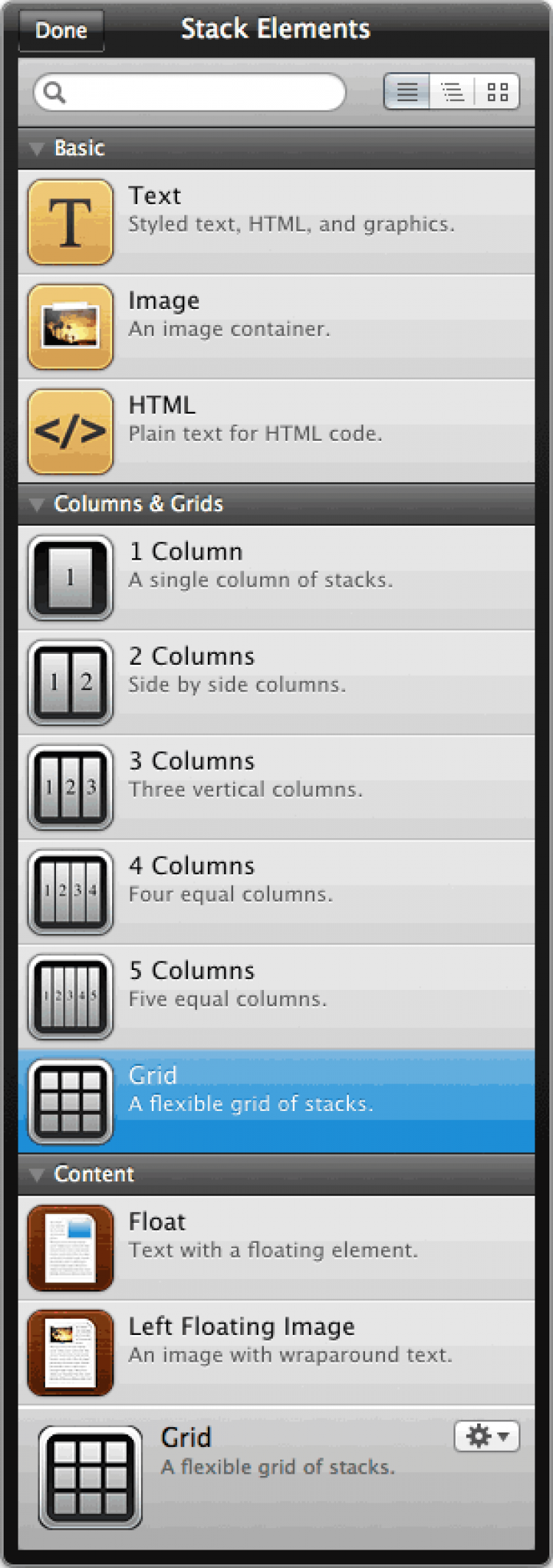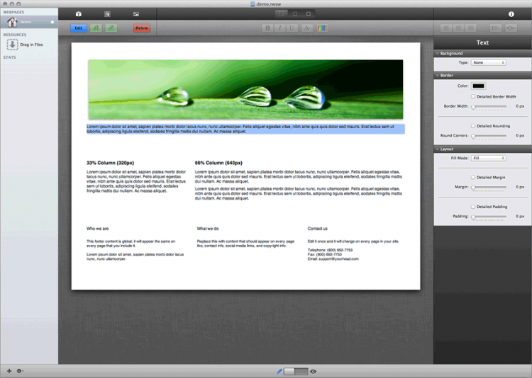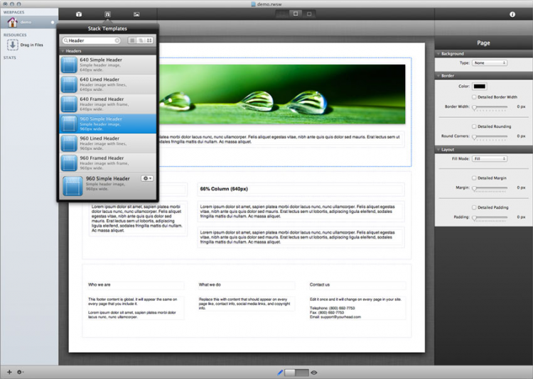 Stacks Дополнение для RapidWeaver, которое позволяет с легкостью создавать веб-страницы простым перетаскиванием объектов и блоков. Для этого можно воспользоваться множеством пердлагаемых элементов или сотнями загружаемых стеков от стороннх разработчиков.