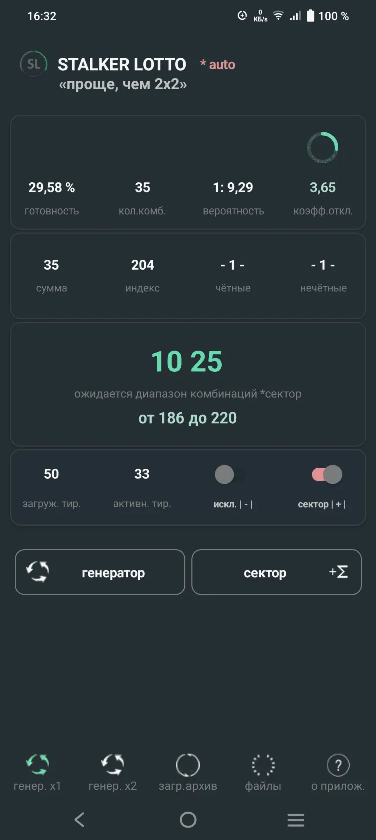 - Генератор довольно сложный, но для пользователя очень простой. Достаточно обновить архив тиражей, нажать кнопку "сектор", затем получить комбинацию или несколько - на серию игр.