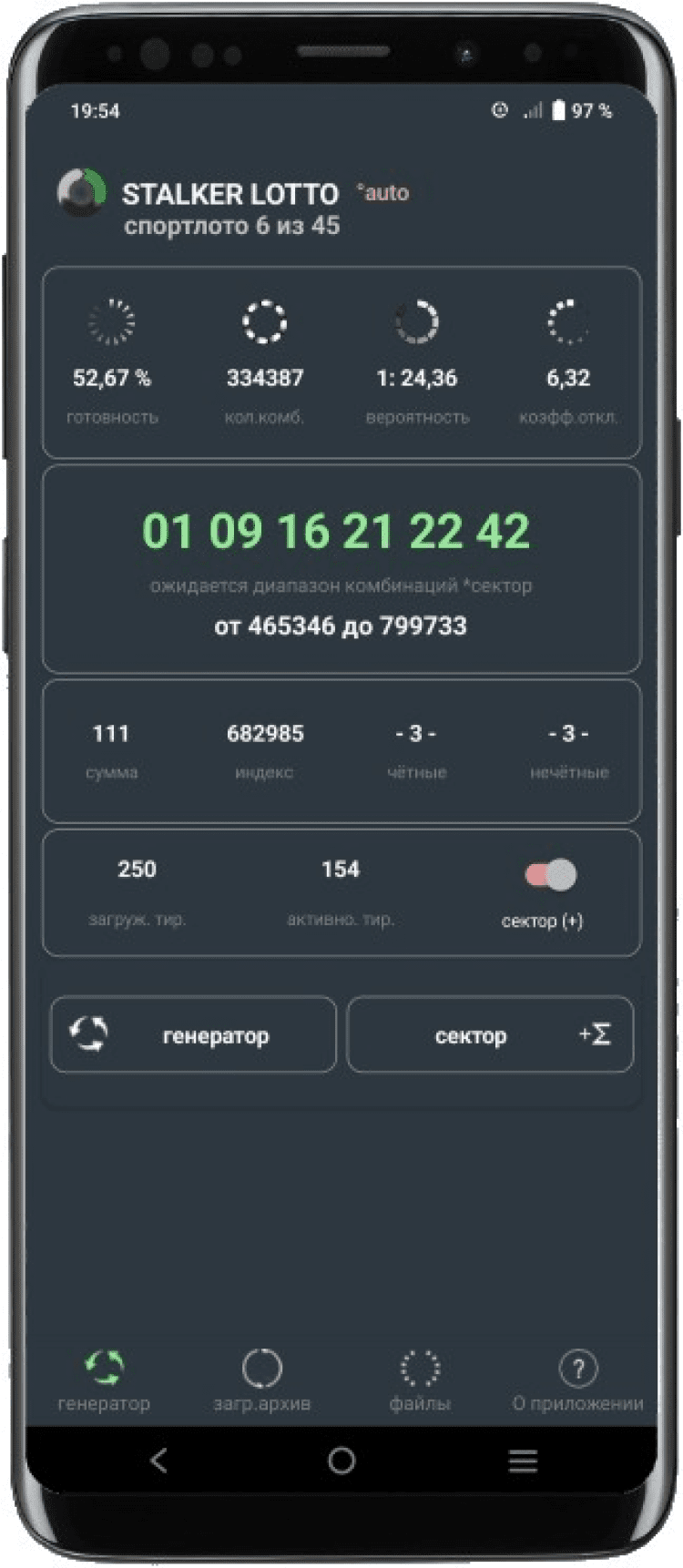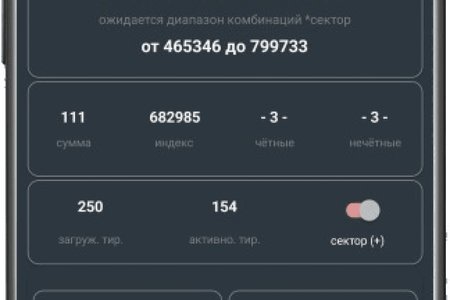 • Генератор довольно сложный, но для пользователя очень простой. Достаточно обновить архив тиражей, нажать кнопку "сектор", затем получить комбинацию или несколько - на серию игр.