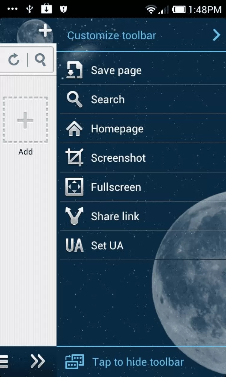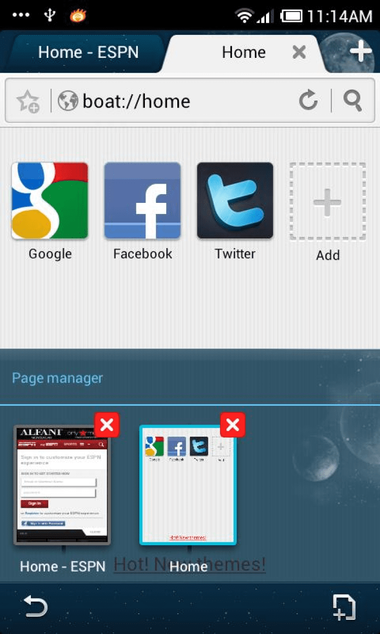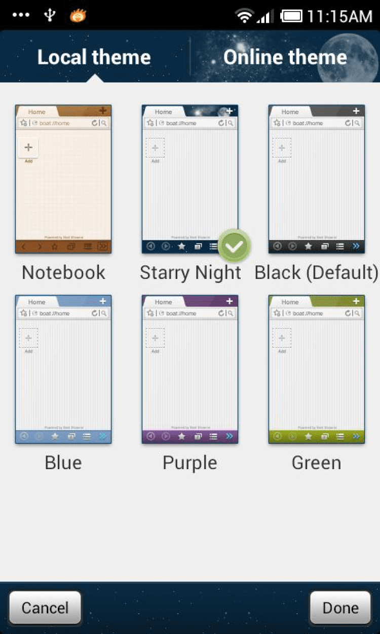 Starry Night Boat Theme Красивая тема оформления для приложения Boat Browser версии 4.4 и выше, выполненная в стиле звездного ночного неба. Перед установкой этой темы, убедитесь что на вашем устройстве установлен Boat Browser.