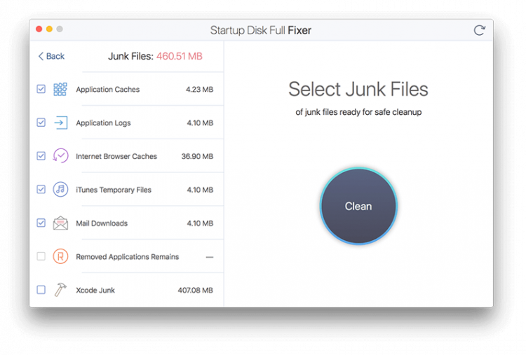 Первое, что делают пользователи Mac, когда загрузочный диск переполнен - это удаляют самые большие файлы с диска. На самом деле на вашем Mac хранятся десятки ненужных файлов, которые можно удалить без сожаления. Startup Disk Full Fixer находит все эти мусорные файлы и позволяет вам безопасно избавиться от них.
