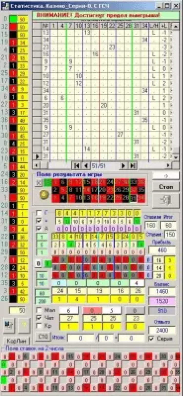 Статист Рулетки - это программа для сбора и анализа статистики выпадения чисел при игре на рулетке в интернет казино. При помощи программы можно научиться играть на рулетке. Она также позволяет проверить выигрышные стратегии и системы игры на рулетке, не подключаясь к казино. Программа сохраняет статистику предыдущих игр. Можно в любой момент повторить прошлые игры, проверить свою тактику и систему игры. Позволяет играть по любой из 11 заложенных в нее систем игры.
