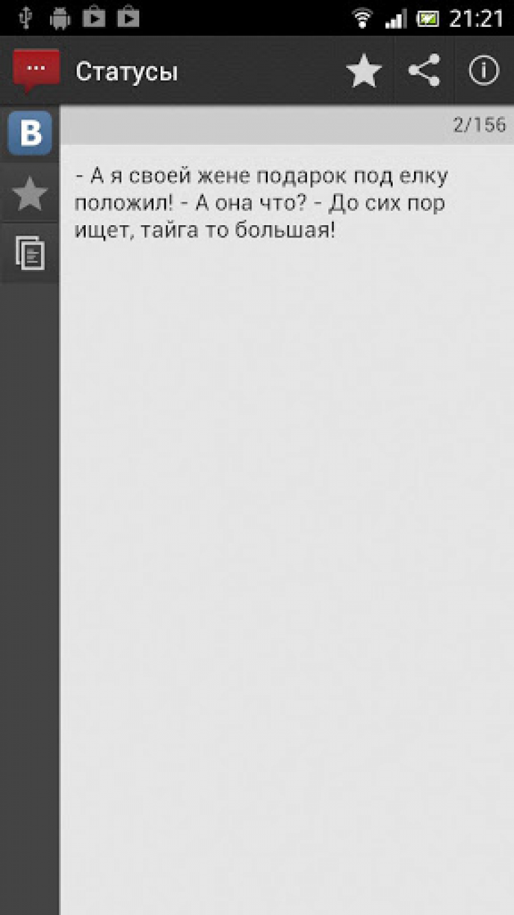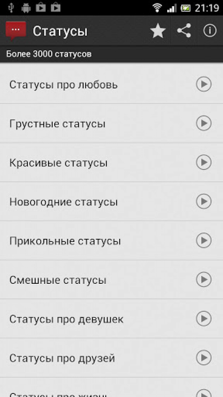 Статусы Это приложение позволяет найти оригинальные и красивые статусы со смыслом на любую жизненную ситуацию: прикольные статусы поднимают настроение, грустные статусы соединяют людей в беде, статусы про любовь помогают сделать признание любимому красивым и оригинальным, статусы про друзей заставят других вспомнить своих забытых в ритме будней друзей.